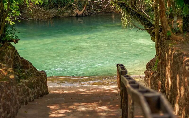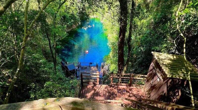 A Lagoa Misteriosa é conhecida pela sua profundidade desconhecida e pela coloração azul intensa. O acesso já é parte da experiência, com uma descida por escadaria em meio à vegetação. Ao chegar, o visual é impactante.