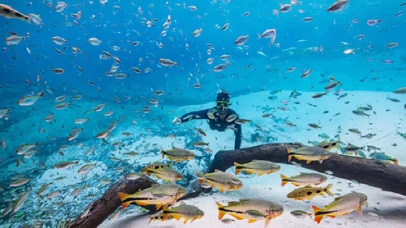 O Rio da Prata é considerado uma das flutuações mais incríveis do Brasil. A experiência começa com uma caminhada leve pela mata, onde já é possível observar aves e pequenos animais. Aos poucos, você chega ao ponto de início da flutuação e percebe que está diante de um verdadeiro aquário natural.