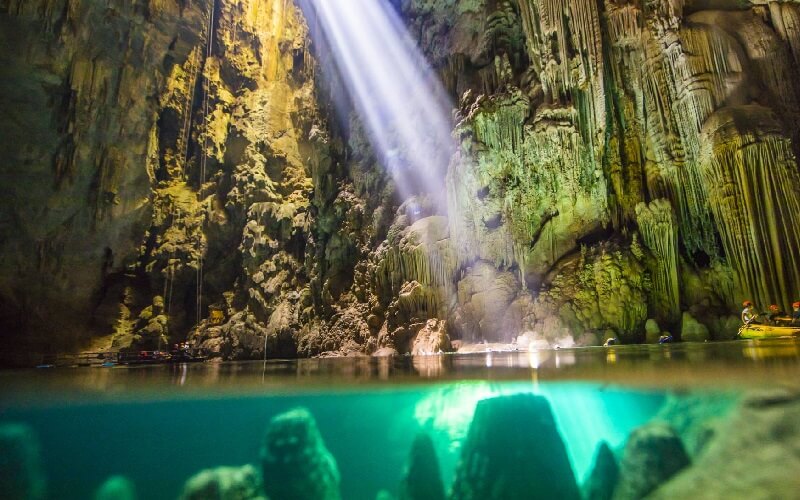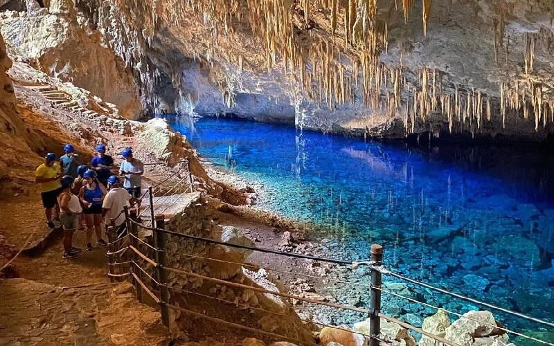 Ao chegar no interior da caverna, você encontra um lago subterrâneo gigantesco cercado por formações calcárias impressionantes. Depois da descida, é possível fazer flutuação, contemplação ou mergulho, dependendo do pacote escolhido.