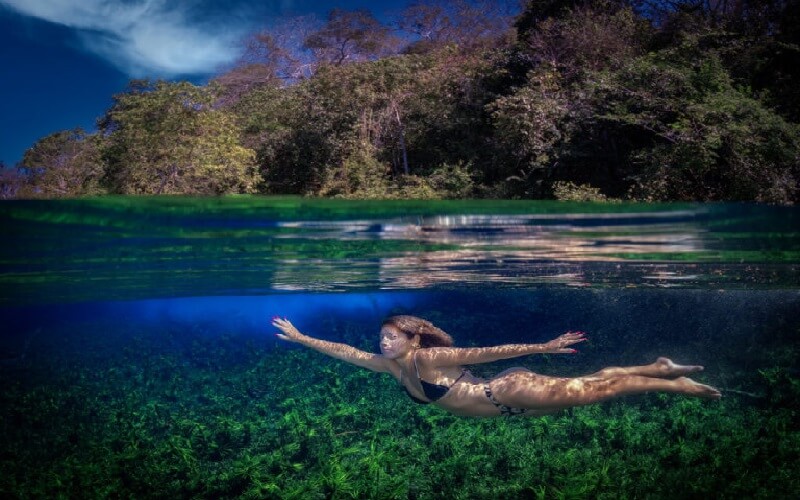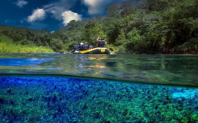 A água é tão transparente que parece invisível, revelando peixes e plantas submersas com uma clareza impressionante. O percurso é tranquilo, guiado e ideal até para iniciantes.