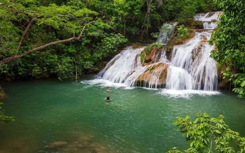 Além das cachoeiras, o passeio inclui a visita à nascente do Rio Chapena, um local de beleza singular, e a uma caverna submersa, onde é possível observar formações naturais impressionantes em águas extremamente claras.